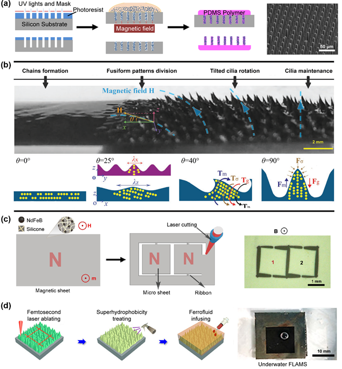 目前制造磁响应微结构功能表面的策略主要包括模板法、磁自组装、激光切割和铁磁流体注入法(图5)。(a)模板法是一种利用高精度模具制造有序的微结构的方法,通过在预先设计的模具中填充磁性颗粒和前驱体,然后在固化前驱体并从模具中取出后得到磁响应微结构功能表面。(b)磁自组装成形是利用磁流体在外部磁场的作用下,自发地对齐并自组装成有序的磁性纤毛阵列的工艺,具有简单、高效的特点,常用来制备磁性纤毛表面。(c)激光切割是利用激光通过热效应直接在各种磁性薄膜上快速切割出磁响应微结构,具有分辨率高,速度快以及灵活性好的优点。(d)铁磁流体注入法是将铁磁流体渗透到具有微结构的基体中。外加磁场能使分散在铁磁流体中的磁性纳米颗粒运动,从而使原始光滑的表面上产生在不同尺度的微结构。